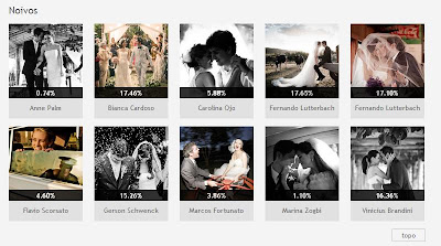 A votação popular estará aberta de hoje até 15 de dezembro, sendo possível votar 1 vez por dia. O resultado, sai no dia seguinte! Vou fazer a minha campanha eleitoral e arrecadar votos para a foto mais bacana da categoria "Noivos", não é?! ;)